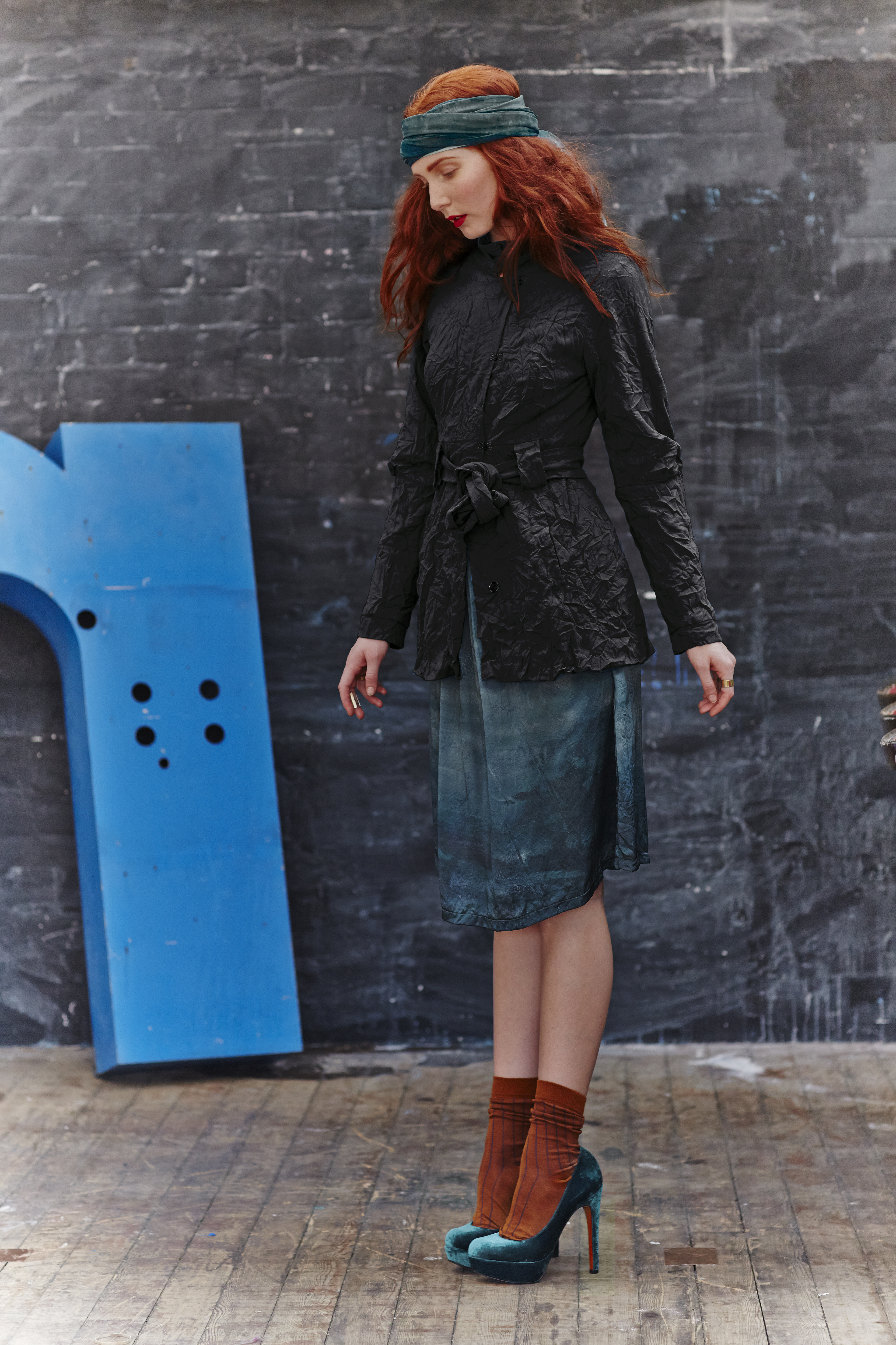 Think loose jackets, trousers, chiffon and silk dresses and petticoats, toe grazing hems, layering, silk print scarves in textures, silhouettes and a palette of colours including army green, winter white, sumptuous blue and ethereal black.